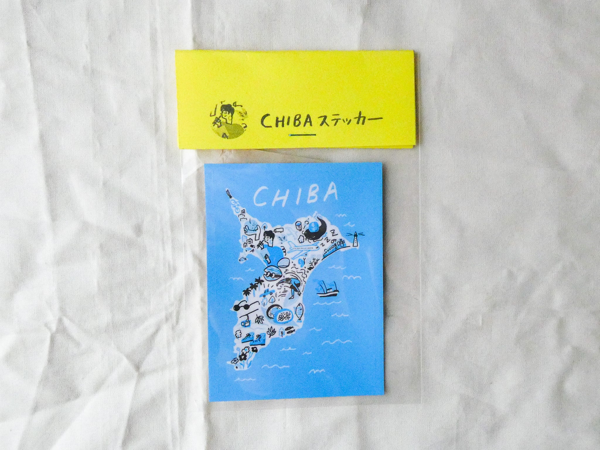ZINE『My hometown Chiba(マイホームタウンちば)』の表紙でもある、千葉の名産品や観光スポットをちりばめたイラストマップのステッカーです。